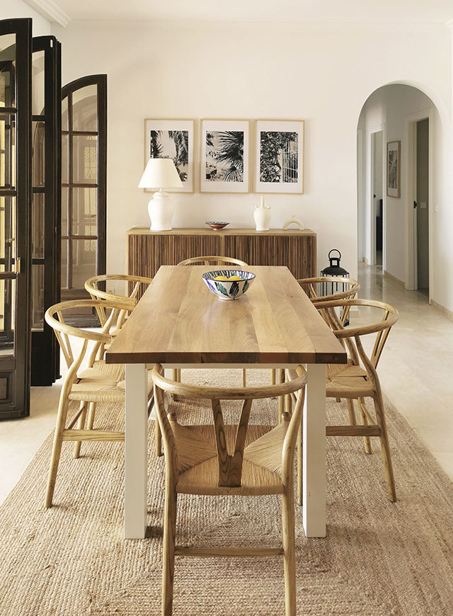 Conservamos el pavimento original, por lo que añadimos detalles en madera en el mobiliario para logar un aspecto más acogedor y mediterráneo. Para la cocina, diseñamos frentes en madera de roble con tiradores en negro y marco perimetral. Añadimos una zona de vitrina y baldas para exponer objetos decorativos.